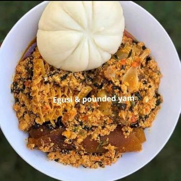 smoothly blended African wild mango seeds cooked in hot palm oil. water, smoked (dry) fish, crayfish and salt to taste.